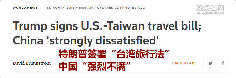 【觀察者網綜合報道】外界本猜測特朗普會以不動聲色的方式讓“台灣旅行法”自動生效,不過他在16日下午還是選擇以簽署的方式使法案生效。