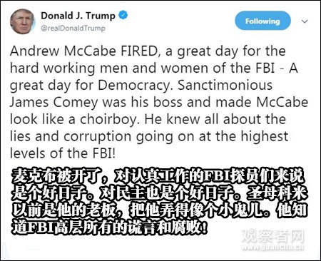 而特朗普知道這個消息後也非常愉快,他立刻更新了自己的推特。稱讚麥克布被開是個好日子。