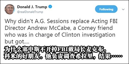 其實麥克布和特朗普之間的分歧已經不算是新聞了。麥克布曾經負責希拉里“郵件門”的調查,最後希拉里安全落地。特朗普指責是麥克布的太太接受了希拉里的“政治獻金”。