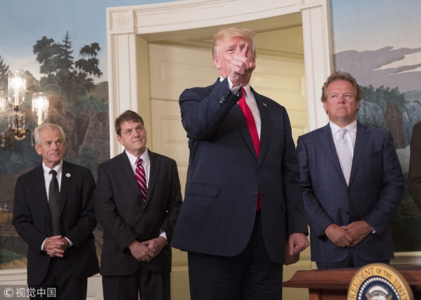 當地時間2017年8月14日,美國華盛頓,美國總統特朗普在白宮簽署行政備忘錄,指示美國貿易代表萊特希澤針對所謂“中國不公平貿易行為”發起調查,以確保美國的知識產權和技術得到保護。這意味着萊特希澤或將援引美國《1974年貿易法》第301條,對中國發起“301調查”。(@視覺中國)