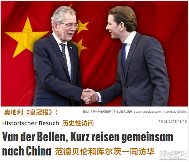 【觀察者網 綜合報道】“奧地利歷史上最大的國事訪問”,據奧地利《維也納日報》報道,奧地利總統範德貝倫 (Alexander Van der Bellen) 和總理庫爾茨(Sebastian Kurz)4月將一同訪問中國。總統和總理同時出訪同一個國家,在奧地利歷史上尚屬首次,多家媒體都以“歷史性訪問”為題進行報道。