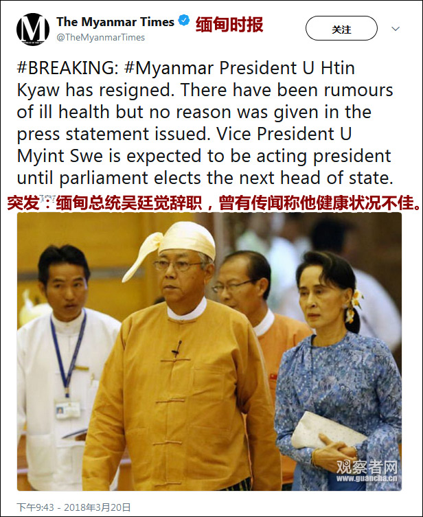 【觀察者網綜合報道】新華社快訊:緬甸總統府3月21日宣佈,總統吳廷覺當天辭去總統職務。