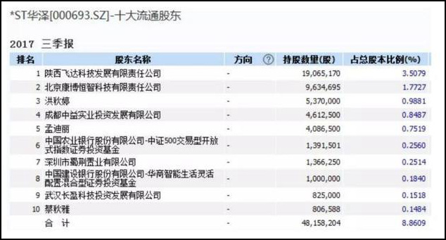 據Wind數據顯示,*ST華澤十大流通股東中有兩隻基金,其中南方中證500ETF持有139萬股,佔總流通股本持股比例0.50%,華商智能生活持有100萬股,佔總流通股本持股比例0.36%。