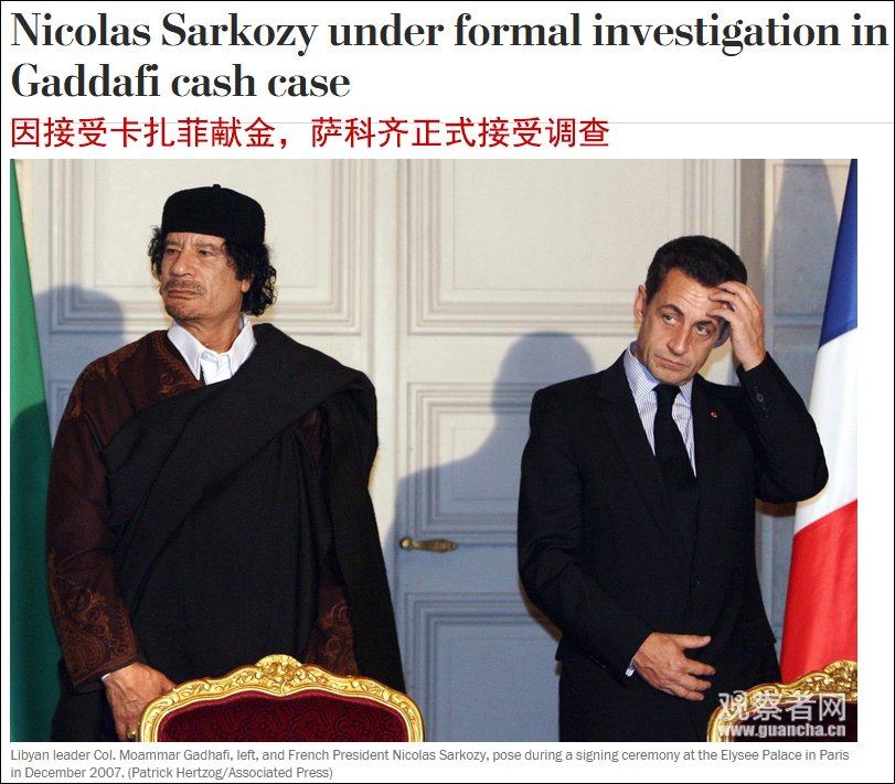 《華盛頓郵報》21日報道稱,當天晚上,法國司法部門對薩科齊正式立案審查,罪名是涉嫌收受賄賂和非法競選資金,並挪用利比亞公共資金。