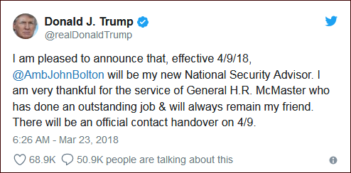 “我非常高興地宣佈,從2018年4月9號開始,約翰·博爾頓將是我新任的國家安全事務助理。”特朗普3月22號下午在推特中宣佈,“我非常感謝麥克馬斯特將軍的傑出工作,我們將一直保持朋友的關係。正式的工作交接將在4月9號進行。”