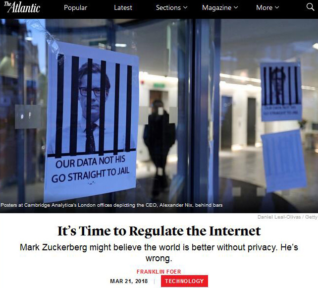 美國《大西洋月刊》編輯弗蘭克林·福爾3月21日刊發評論文章:《是時候規範互聯網了》