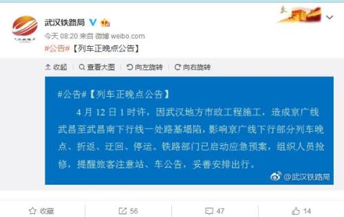 【觀察者網 綜合報道】4月12日1時許,因武漢地方市政工程施工,造成京廣普速鐵路武昌至武昌南間下行線路路基塌陷130餘米,影響京廣線下行部分列車晚點、折返、迂迴、停運,但武廣高鐵不受影響。