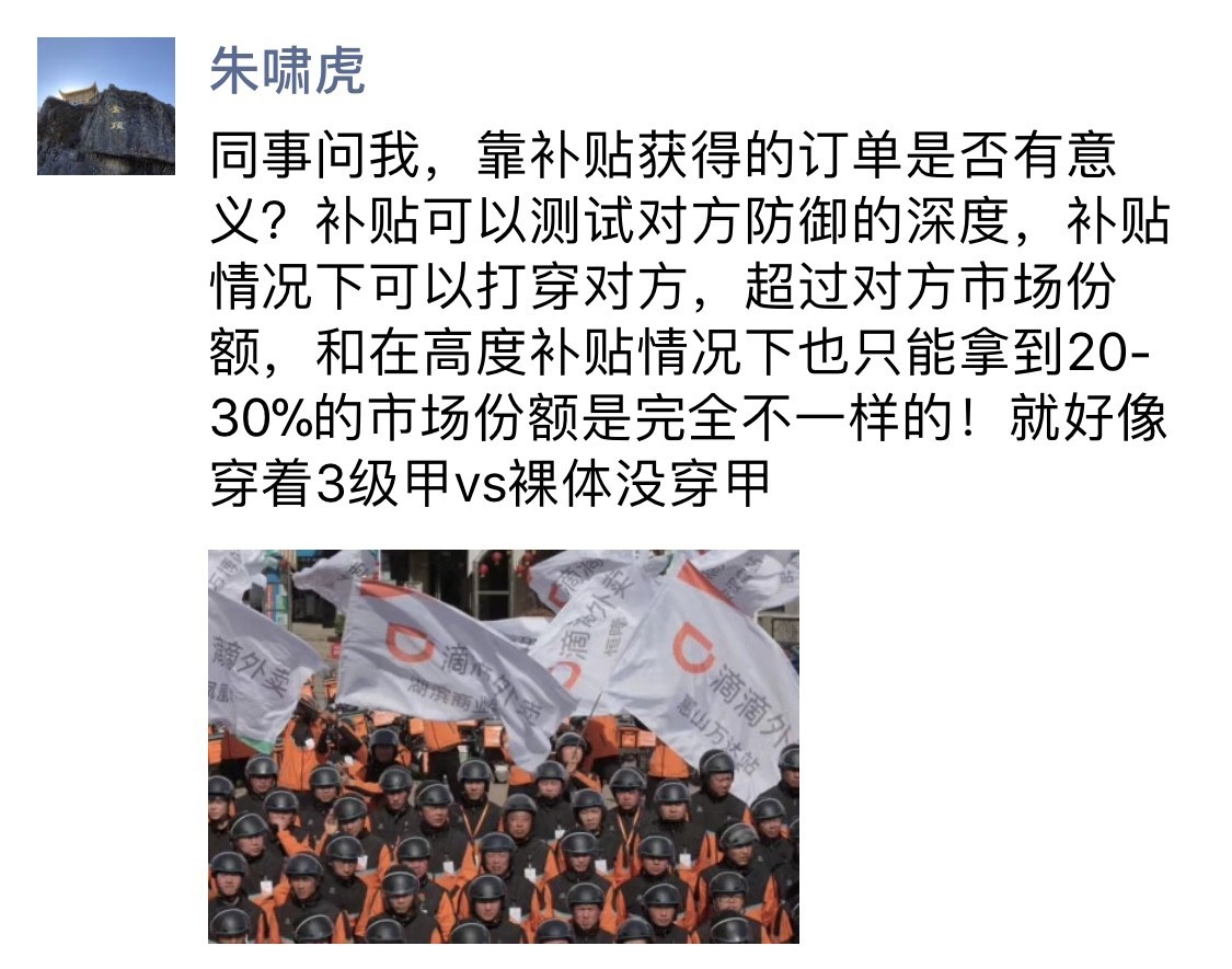 針對滴滴和美團的這些你來我往,朱嘯虎在朋友圈中評價稱,補貼可以測試對方防禦的深度,補貼情況下可以打穿對方,超過對方市場份額,和在高度補貼情況下也只能拿到20-30%的市場份額是完全不一樣的!就好像穿着3級甲VS沒穿甲。
