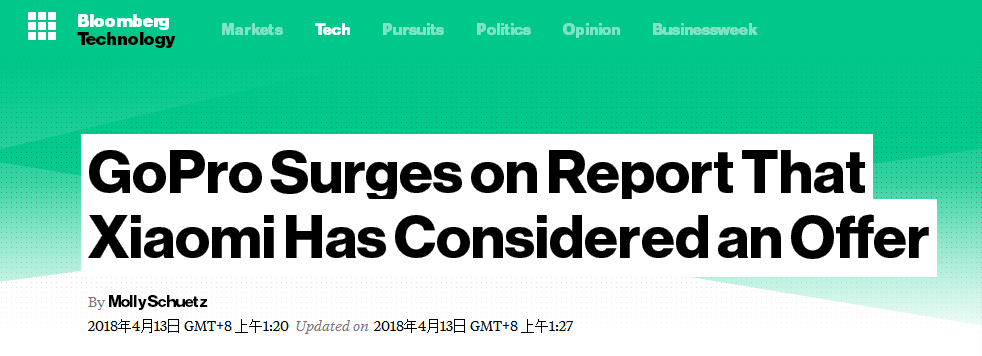 據彭博社報道,小米正考慮收向GoPro拋出橄欖枝。