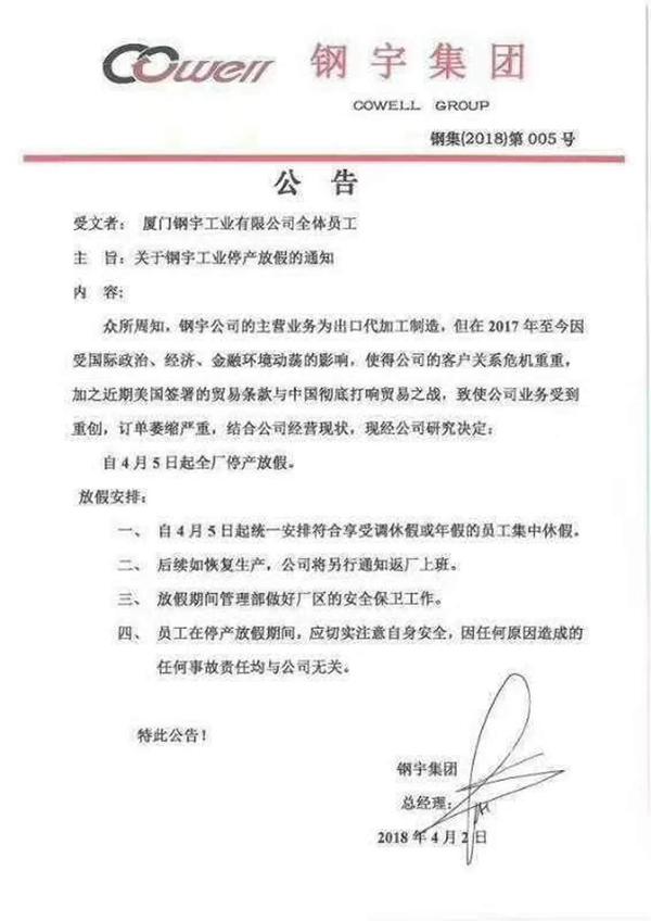 “2017年至今因受國際政治、經濟、金融環境動盪的影響,公司的客户關係危機重重,加之近期美國簽署的貿易條款與中國徹底打響貿易之戰,致使公司業務受到重創,訂單萎縮嚴重,結合公司經營現狀,現經公司研究決定:自4月5日起全廠停產放假。”