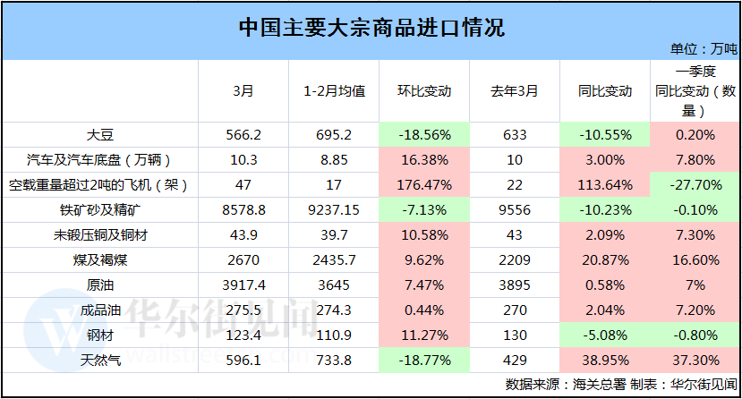 華爾街見聞稱,相比1-2月均值,3月大豆進口量跌至566.2萬噸,環比下滑18.56%,同比減少11%。3月鐵礦石的進口環出現7%的下滑。而其他主要大宗商品的進口,均有不同程度的擴大。穀物環比增速接近20%,鋼材和銅的進口量環比增速都在10%以上。