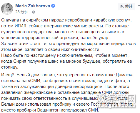當天稍早時候,俄駐美大使館在社交媒體facebook上發文中稱,俄駐美大使阿納託利⋅安託諾夫(Anatoly Antonov)就此次敍利亞問題發佈聲明: