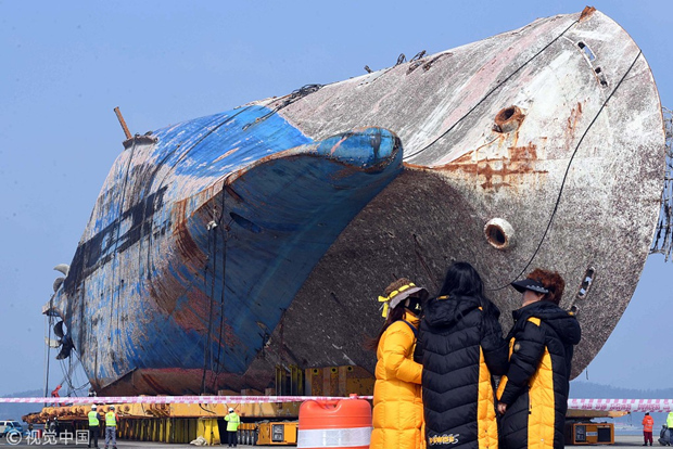 2017年3月25日晚,“世越號”船體整體被打撈出水。