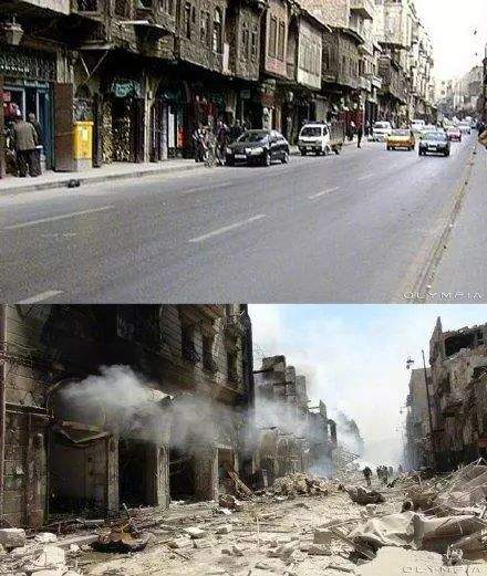 一組圖看敍利亞戰爭前後對比 2018-04-15 這組圖由敍利亞的奧林匹亞飯店2016年上傳網絡,敍利亞第一城市阿勒頗,已然滿目荒夷。戰爭仍未結束,直至今日。 再次驗證那句話: 我們不是生活在一個和平的年代, 而是生活在一個和平的國家。