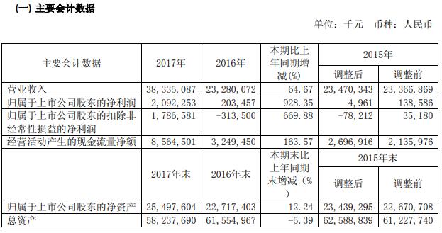 三一重工16日晚發佈的年報顯示,2017年實現營收383.35億元,同比增長64.67%;歸屬於上市公司股東的淨利潤20.92億元,同比增長928.35%。