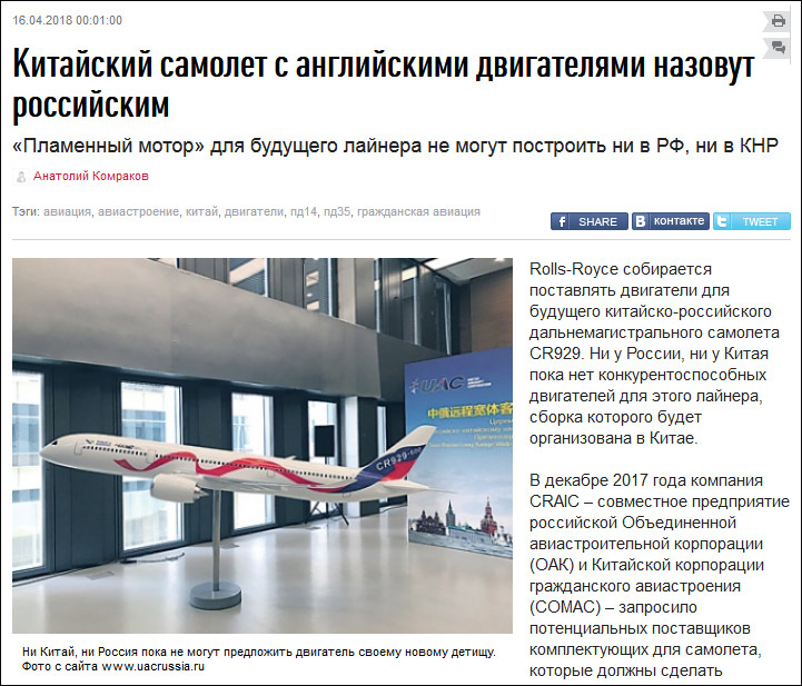 俄羅斯《獨立報》16日報道稱,英國羅羅公司Rolls-Royce計劃為中俄聯合研發的CR929遠程寬體客機提供發動機。