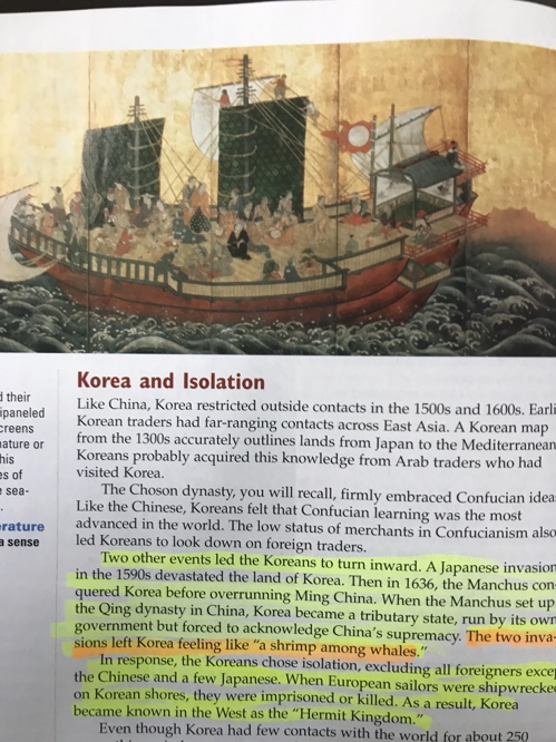 世界知名教科書出版商普林第斯霍爾則是這樣描寫韓國曆史:“1590年,日本的入侵蹂躪了韓國的土地,1636年,滿族人又攻佔並附庸了韓國。中日兩大國的接連入侵讓韓國就像夾在鯨之間的小蝦一樣。”