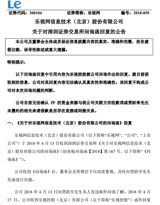 4月17日晚間,樂視網回覆深交所問詢函稱,公司目前無法確認 FF 的資金來源與我公司關聯方應收款項、賈躍亭未履約的相關承諾借款是否存在直接或間接關係。公司正在積極與樂視非上市體系進行協調,責成關聯方切實解決上市公司對非上市體系公司因歷史關聯交易形成的關聯應收款,緩解公司資金壓力。