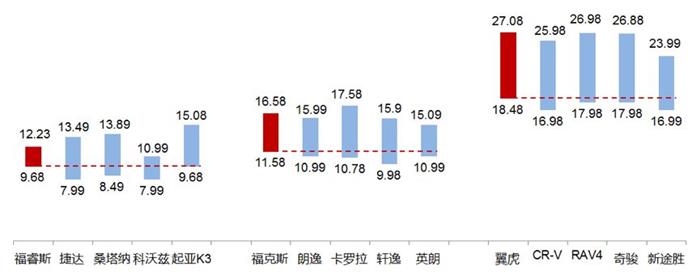 從價格來看,福睿斯、福克斯和翼博等價格普遍偏高,這其中福睿斯比科沃茲、捷達等車型高出1.2萬~1.6萬,福克斯比朗逸、卡羅拉等高出0.6萬~1.5萬,而翼虎也是比CR-V、RAV4等車型高出0.5萬~1.5萬。