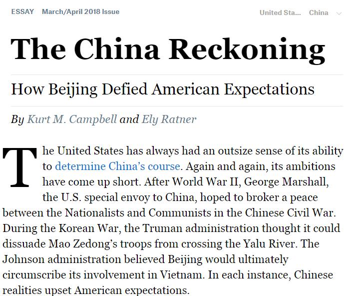 2018年3月4月美國《外交事務》雜誌合刊上刊登了題為《中國的懲罰》的文章。一位作者是庫爾特·坎貝爾,他現在是亞洲集團主席,曾於2009年至2013年任美國國務院負責東亞和太平洋事務的助理國務卿;另一位作者是艾麗·蘭特娜,現為外交關係委員會中國研究部的高級研究員,2013年至2015年曾任美國副總統拜登的副國家安全顧問。