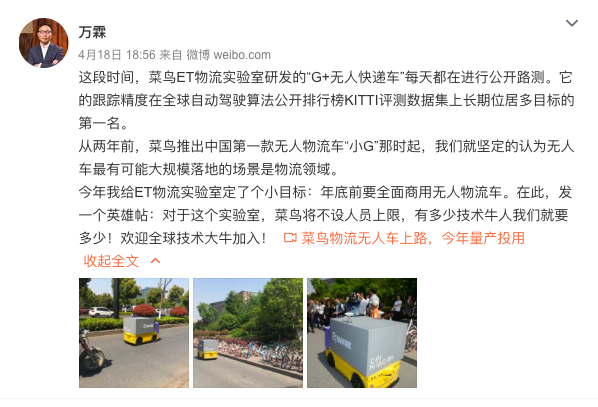 【觀察者網TMT報道】4月18日,菜鳥網絡公開了一段自主研發的物流無人車路測實況影像,並透露無人駕駛技術在物流領域已經成熟,今年內將商用量產無人車。同日,菜鳥網絡總裁萬霖在社交媒體上表示,菜鳥堅定的看好無人車在物流領域的應用落地,並放出攬才豪言,“菜鳥ET物流實驗室的招牌人數不設限,牛人全都要。”
