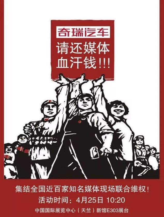 海報內容顯示,醒目的“奇瑞汽車請還媒體血汗錢!!!”大字直接突出這次被聲討的主角奇瑞,而參與維權的是“媒體”,以往針對汽車廠家維權的通常都是車主,而作為媒體與廠家的關係一向都是很和諧,這次媒體聲討奇瑞,想必這其中也是肯定不簡單。