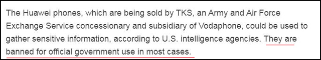 報道援引美情報機構的話稱,華為手機可用於收集敏感信息,“在美國政府官方使用上,已被拉入黑名單”。