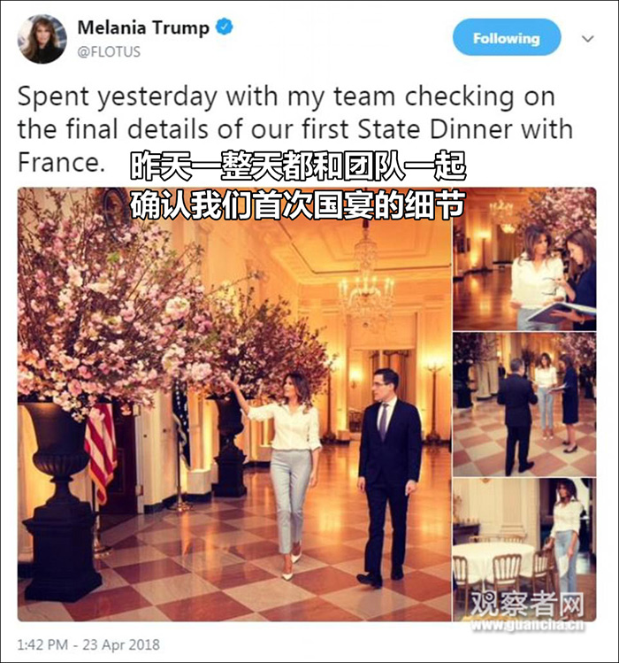 按照日程,特朗普政府的首次國宴將在當地時間24日晚(北京時間25日)舉行,第一夫人已經為此忙碌起來。