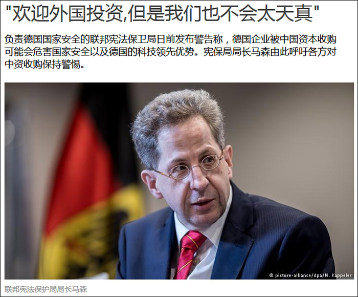 另據德媒4月12日報道,負責德國國家安全的聯邦憲法保衞局日前警告稱,德國企業被中國資本收購可能會危害國家安全以及德國的科技領先優勢。憲保局局長馬森(Hans-Georg Maaßen)呼籲各方對中資收購保持警惕。