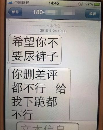 4月24日上午10點33分,李海峯的手機收到兩條短信“希望你不要尿褲子。你刪差評都不行,給我下跪都不行。”