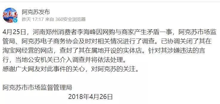 4月25日,河南鄭州消費者李海峯因網購與商家產生矛盾一事,阿克蘇市場監管局、阿克蘇電子商務協會及時對相關情況進行了調查。已協調關閉了其在淘寶網經營的網店,查封了其在屬地開設的實體店。針對其涉嫌違法的言行,當地公安機關已介入調查並將依法處理。