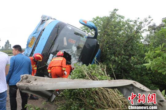 消防官兵到達現場後發現,客車側翻在高速路邊的溝中,路邊護欄被撞斷,車底還壓有兩名男乘客。