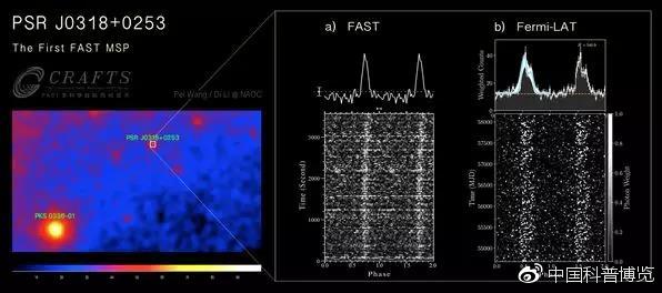 新發現的脈衝星J0318+0253自轉週期5.19毫秒,根據色散估算距離地球約4000光年,由FAST使用超寬帶接收機進行一小時跟蹤觀測發現,是至今發現的射電流量最弱的高能毫秒脈衝星之一。