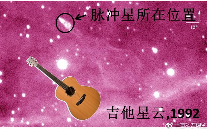為啥只有這麼少量的脈衝星是待在超新星遺蹟邊上的?答案是:這些都是些年輕的脈衝星。而當脈衝星“長大”(這裏只是表示年齡變大,不是指體積、質量變大)之後,就會離開“襁褓”了。一個著名的例子是吉他星雲及其中的脈衝星。