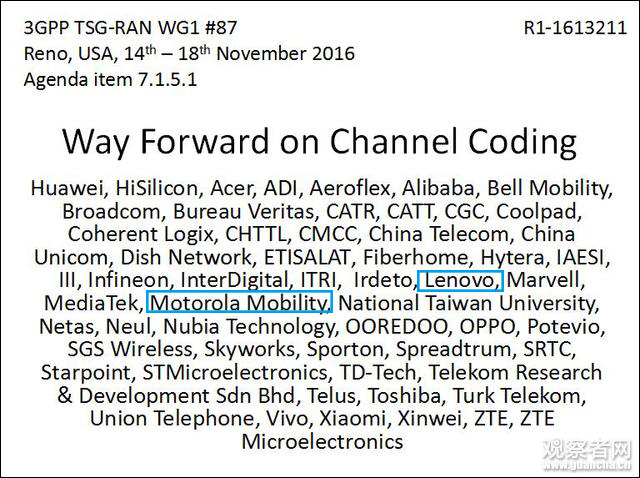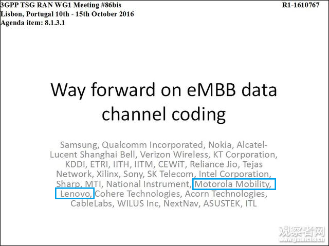 觀察者網查詢會議記錄發現,在那次會議上,數據信道編碼標準是主要討論內容,聯想聯署了支持將LDPC碼成為eMBB數據信道的唯一編碼方案。