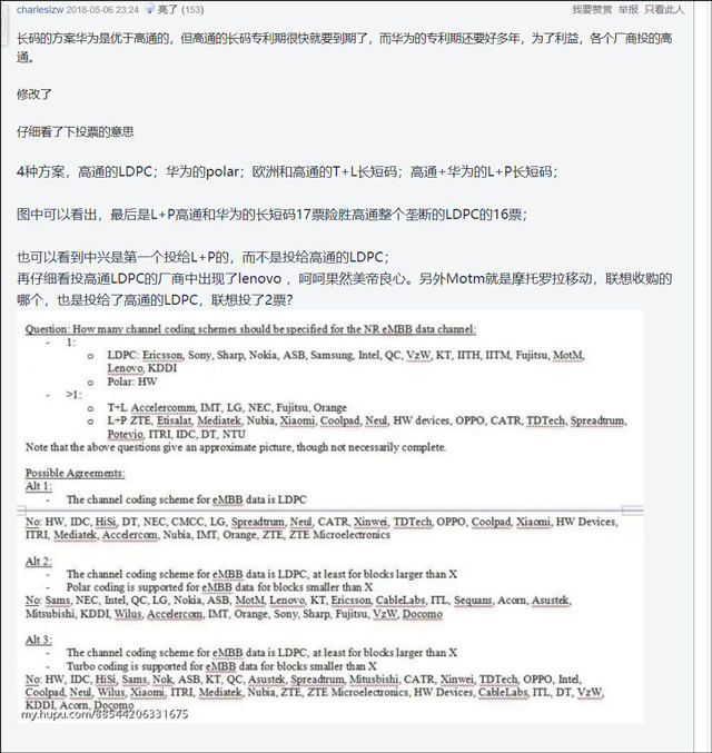 然而,聯想也確實在前一次會議上支持過由高通主導的LDPC碼,有網友認為,這破壞了中國企業的統一戰線。