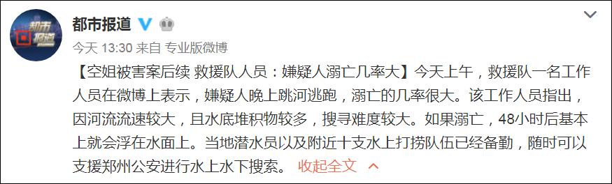 另據河南電視台《都市報道》官方微博11日下午1點30分報道,今天上午,救援隊一名工作人員在微博上表示,嫌疑人晚上跳河逃跑,溺亡的幾率很大。