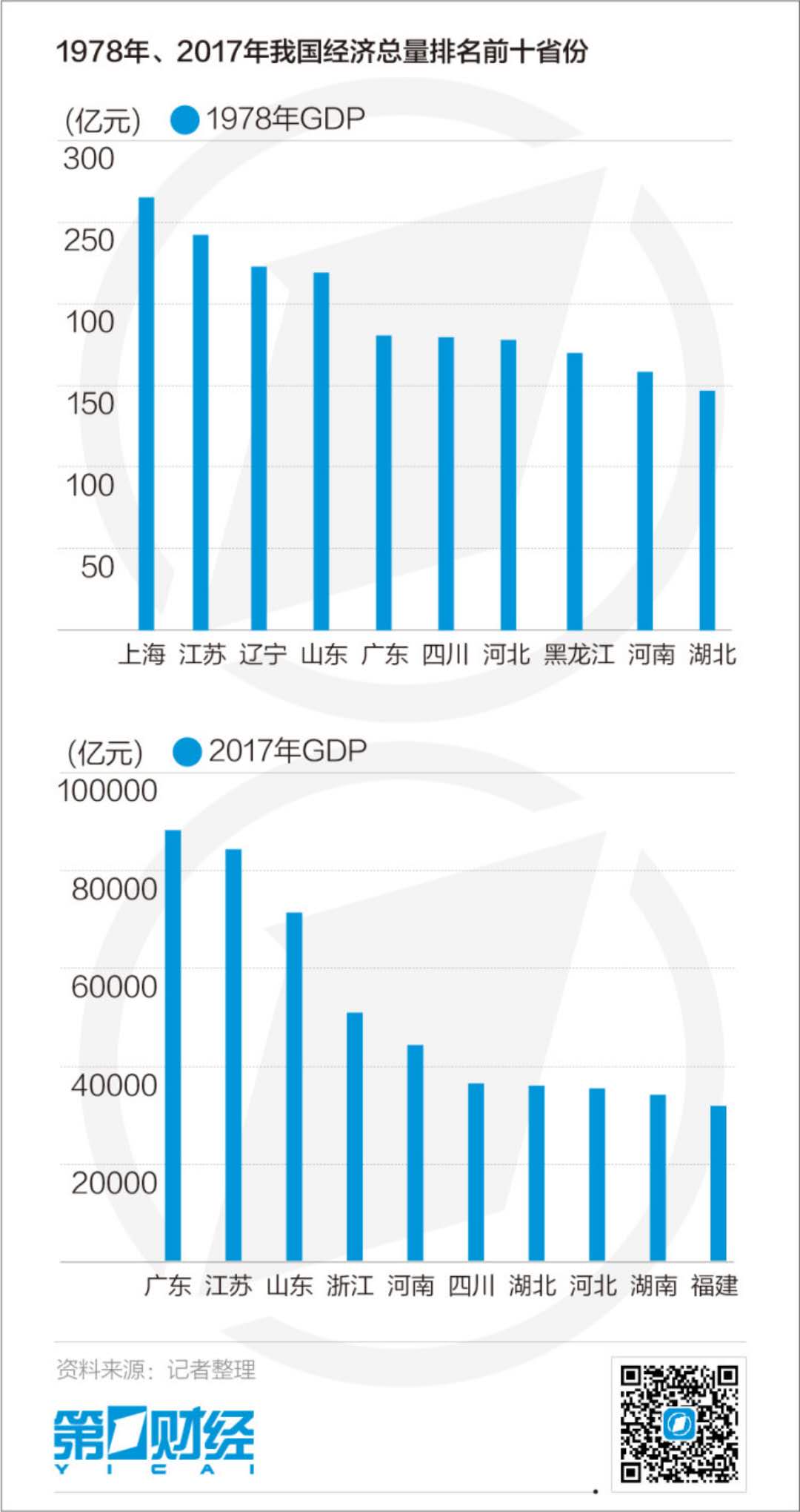 研究表明,在不計港澳台的情況下,新中國成立後到改革開放以前,北方地區佔全國經濟總量的份額基本上在50%左右小幅波動。從1978年各省份的GDP總量來看,上海和江蘇位居前兩位,遼寧和山東緊隨其後,位居第三、四位,如今的第一經濟大省廣東當時排名第五。