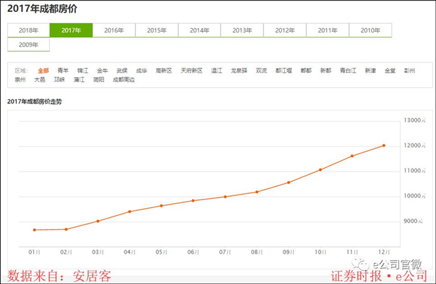 **其中,成都政府的限購限價、土拍政策和人才落户這“三板斧”,使得當地房價在短短一年半之內,實現兩倍甚至三倍(部分區域)的上漲。**而在數字上,成都市二手房價格2017年上漲超過70%,全國第一;而新房價格則全年下降約5%,也創下全國主要城市降幅前列。