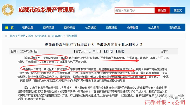 但兩日後的9月23日,成都市房管局官網緊急發佈《加強監管促進我市房地產市場健康發展》的文章,直指近期成都市房地產市場個別企業違規收取誠意金、捂盤惜售、人為炒作等違規行為,推出黑名單制,嚴處違法違規從業者等。9月23日晚間,中德置業在其官方微信公眾號上發佈聲明稱,“網傳一客户一次性購買我司中德·英倫世邦項目60套房屋一事不屬實,因雙方未能達成購買協議,客户已退定。”