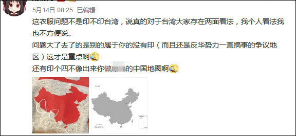 @湯粉兒在另一條微博中提到,除了台灣之外,還有其他屬於中國的領土沒有被印,T恤上的“中國地圖”印出個四不像。
