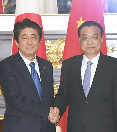 在會談前握手的日本首相安倍晉三和中國國務院總理李克強 日本經濟新聞 圖