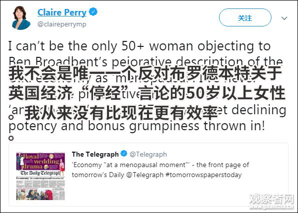保守黨議員克萊爾·佩裏(Claire Perry)發推特反駁布羅德本特,稱自己“從未如此有效率”: