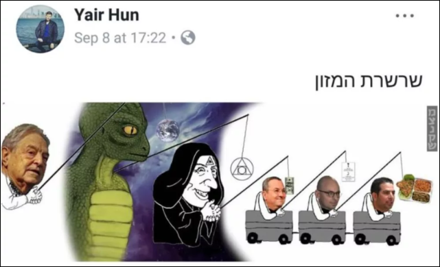 最左側為美籍猶太裔金融大鱷喬治·索羅斯,他手中拿着釣魚竿,上面拴着的誘餌為地球,被這個誘餌吸引的是一個卡通形象“蜥蜴人”,在它右側依次為一個共濟會成員的卡通形象、以色列前國防部長、工黨前領導人埃胡德·巴拉克、以色列律師埃勒達德·亞尼夫,以及處在“食物鏈”最末端的總理官邸前管家梅尼·納夫塔利。