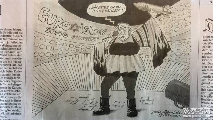 近日,德國《南德意志報》的一幅漫畫引發許多人憤怒。在這幅漫畫上,以色利總理內塔尼亞胡一手託着導彈,一手拿着麥克風,獻藝歐洲歌唱大賽。