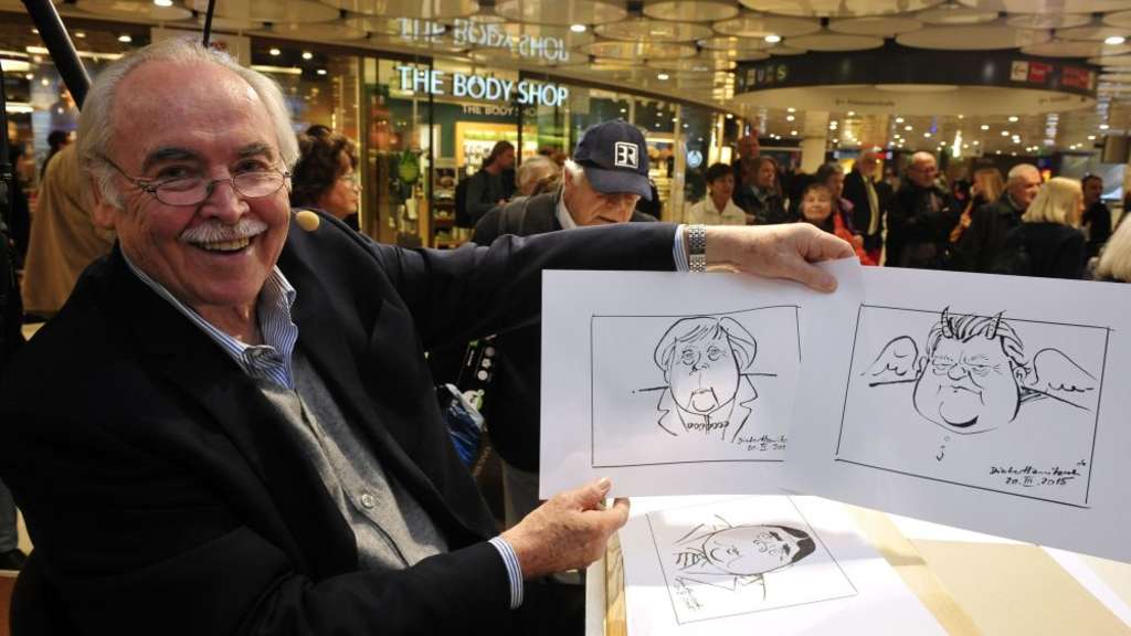 哈尼奇(84歲)與他創作的政治人物漫畫像(德媒圖)