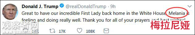 特朗普發推祝賀夫人出院返回白宮,卻拼錯她的名字