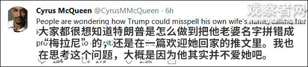 特朗普也迅速發現了這一筆誤。幾分鐘後,他便刪除了原本的推文,並把梅拉尼婭的名字改了過來。