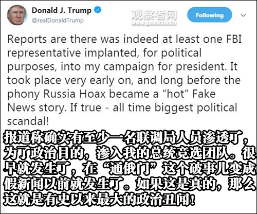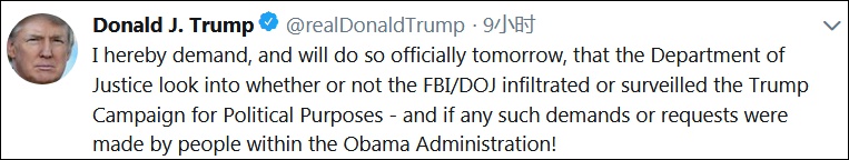 5月20日,美國總統特朗普在推特上宣佈他將在今天正式要求美國司法部調查,前總統奧巴馬政府是否曾基於政治目的,要求聯邦調查局(FBI)滲透或監視他的競選團隊。