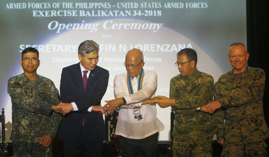 5月9日,菲律賓防長洛倫扎納(中)參加美菲聯合軍演啓動儀式